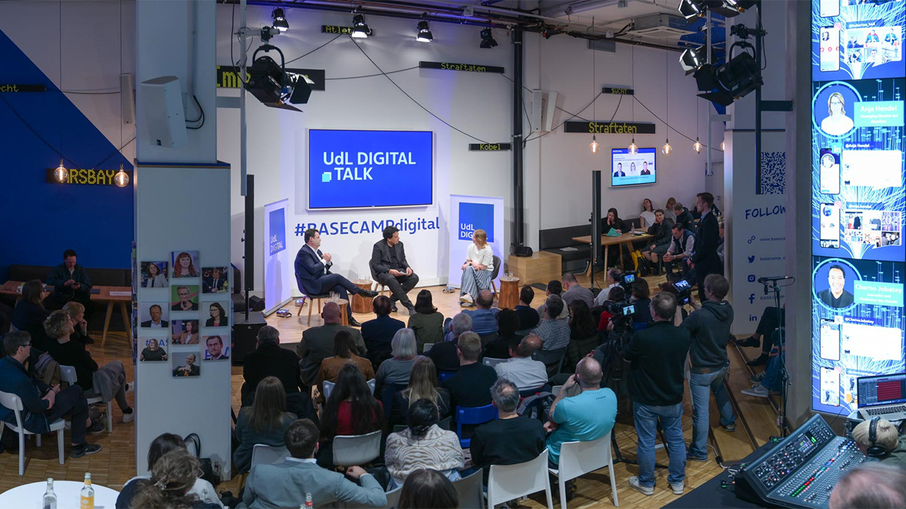 Gastgeber Cherno Jobatey (öffnet in neuem Tab) wollte von den beiden Gästen wissen, ob Deutschland gut genug gerüstet ist für die neue Arbeitswelt, in der generative Künstliche Intelligenz eine entscheidende Rolle spielen wird – und ob wir nicht schon mittendrin sind im Wandel. Dass dieses Thema von großer Relevanz ist, zeigte sich auch am zahlreichen Publikum, das für diese Ausgabe des UdL Digital Talk (öffnet in neuem Tab) ins BASECAMP gekommen war.