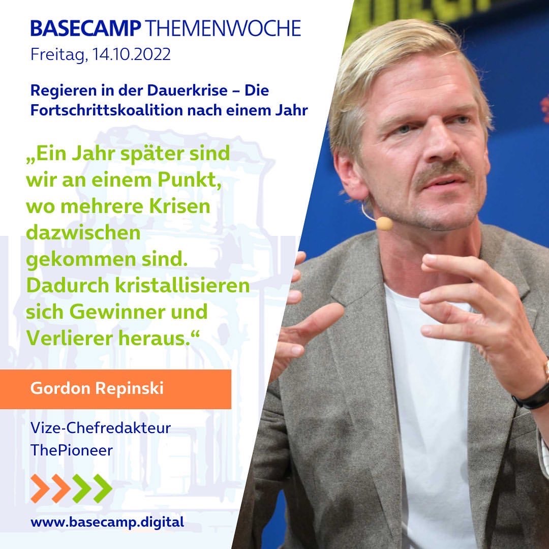 „Mehr Fortschritt wagen“ – diesen Titel gab die Ampel-Koalition ihrem Regierungsprojekt vor etwa einem Jahr. Die Aufbruchsstimmung war jedoch schnell passé: Der Krieg kam, Pandemie und Klimakrise blieben. Über das Regieren in der Dauerkrise und den Koalitionsfrieden sprachen im BASECAMP Marie-Agnes Strack-Zimmermann (FDP), Dorothee Martin (SPD), Tobias Lindner (B90/Die Grünen) und Gordon Repinski (ThePioneer) gemeinsam mit unseren Partnern von polisphere.