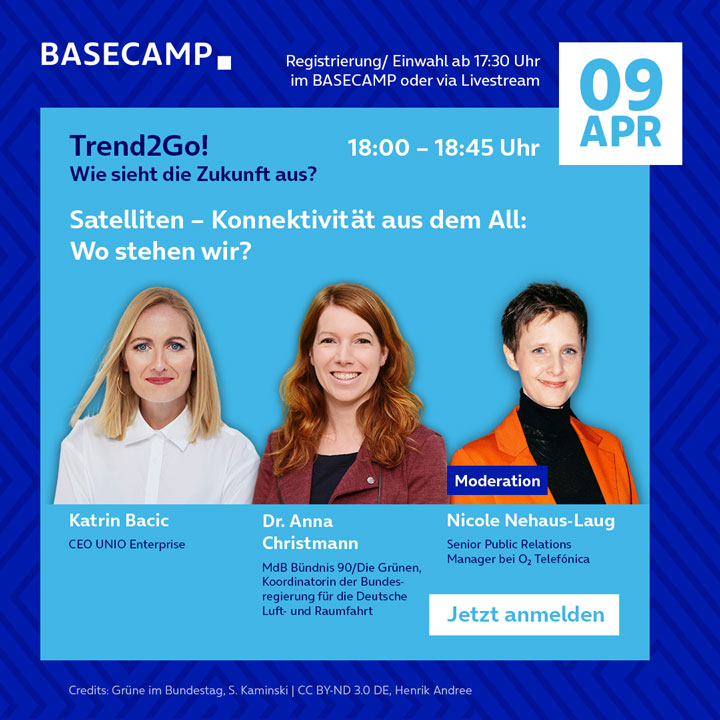 Einen neue Raumfahrtstrategie der Bundesregierung hat 2023 die deutsche Weltallstrategie von 2010 abgelöst, denn Raumfahrt ist raus aus der Nische und zählt inzwischen zur „kritischen Infrastruktur“. „Es ist in der Breite gar nicht bekannt, wie wichtig das Weltall für uns ist“ erklärte Anna Christmann, grüne Bundestagsabgeordnete und Koordinatorin für die deutsche Luft- und Raumfahrt sowie Ansprechpartnerin für Startups, in der Veranstaltungsreihe „Trend2Go“ – im BASECAMP von O2 Telefónica in Berlin-Mitte.