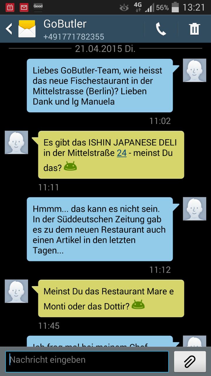 Das Angebot von GoButler erinnert an einen Geist aus der Flasche – nur mit dem Unterschied, dass man mehr als nur drei Wünsche frei hat. Das Prinzip ist ganz einfach: Man registriert sich online unter: http://www.gobutlernow.com/ und erhält kurze Zeit später die Registrierungsbestätigung via E-Mail. Und dann kann es auch schon losgehen: Einfach eine SMS mit dem jeweiligen Wunsch bzw. Auftrag an die angegebene Nummer verschicken und kurze Zeit später erhält man direkt ein entsprechendes Feedback von einem der Teammitglieder, die 24/7 für ihre Kunden da sind. In Zeiten der SMS-Flats entstehen für den Nutzer keine zusätzlichen Kosten. Auf der Facebook-Seite von dem quirligen Start-up kann man sich einen guten Eindruck verschaffen, was für Aufträge bei den Berlinern so eingehen: https://www.facebook.com/gobutlernow?fref=ts. Die einen bestellen Pizza, lassen Flüge buchen oder auch Blumen über GoButler verschicken und die anderen bitten den SMS-Butler, für sie mit der Freundin Schluss zu machen. Klar. Das „Schluss machen via SMS“ können auch andere erledigen, da muss man sich nicht selber die Finger schmutzig machen. Der Case ist ein wenig verstörend, aber auch solche ungewöhnlichen Fälle erledigt das Start-up für ihre Kunden.