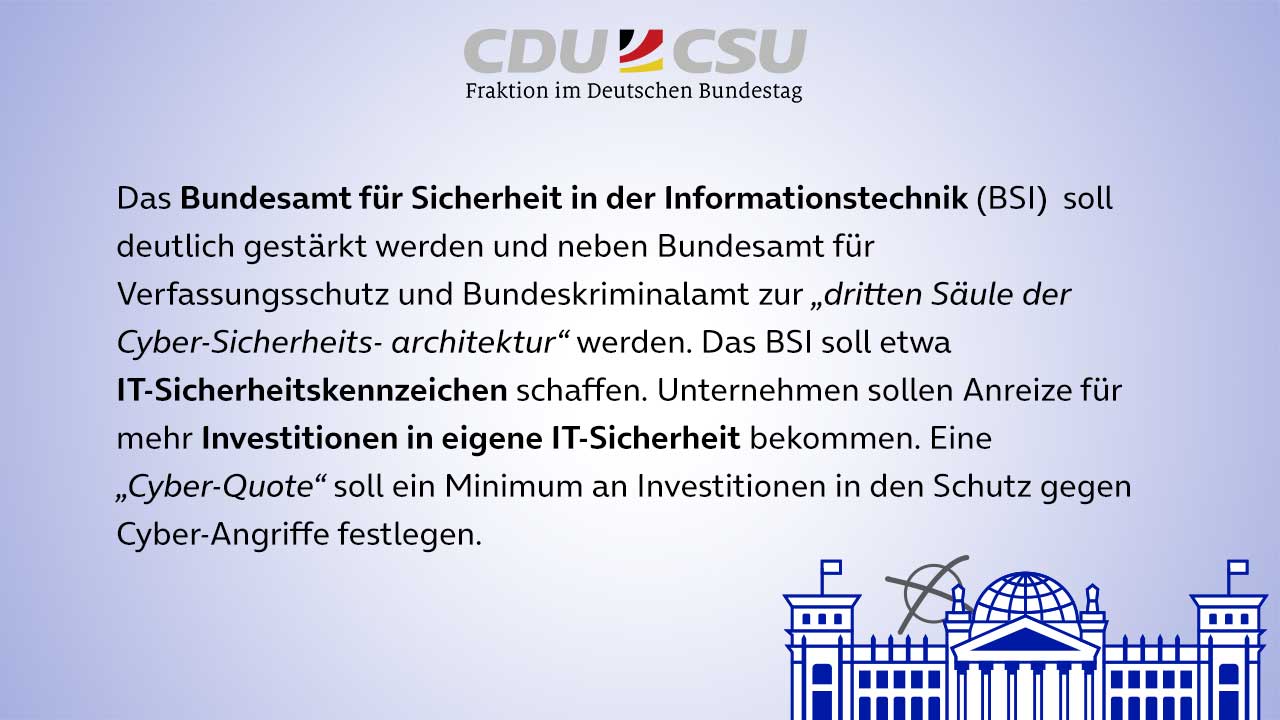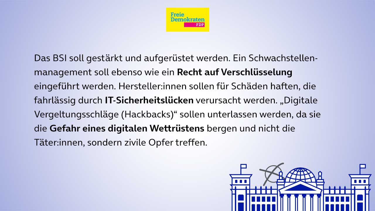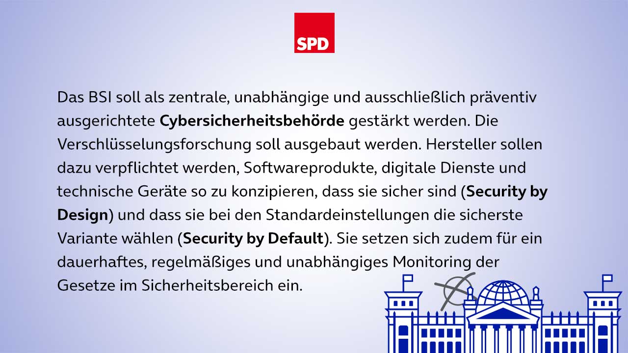 In unserer dreiteiligen Serie zu den Wahlprogrammen der Parteien CDU/CSU (öffnet in neuem Tab), SPD (öffnet in neuem Tab), Bündnis 90/Die Grünen (öffnet in neuem Tab), FDP (öffnet in neuem Tab) und Die Linke (öffnet in neuem Tab) für die Bundestagswahlen im September (öffnet in neuem Tab), blicken wir zunächst darauf, wie sie sich zu den Themen IT-Sicherheit, Digitale Infrastruktur und Verbraucherschutz positionieren. Was sind ihre Forderungen, was ihre Antworten, um den drängenden Fragen in diesen Bereichen gerecht zu werden? Wir geben einen Überblick über einige der zentralen Vorschläge.