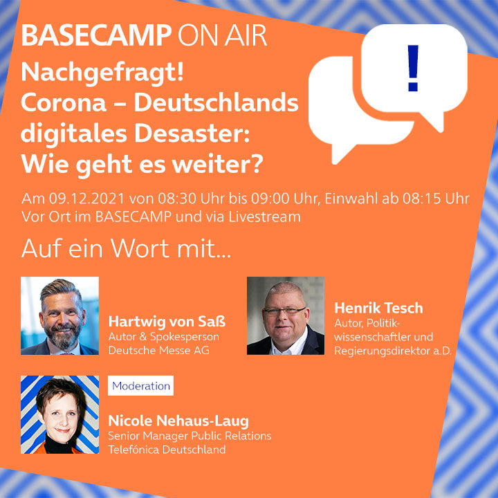 Kein Buch für friedliche Festtage, darin waren sich die beiden Autoren Hartwig von Saß und Henrik Tesch mit der Moderatorin Nicole Nehaus-Laug von Telefónica im Basecamp einig. „Corona – Deutschlands digitales Desaster – Wie ein Land seine Zukunft verspielt“ ist keine angenehme Lesekost.