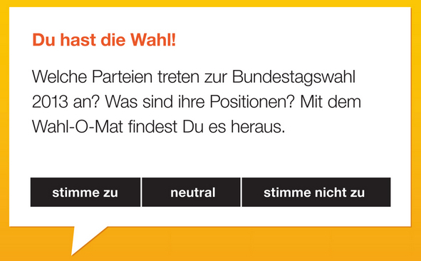 Mittlerweile muss man sich nicht nur zwischen diversen politischen Parteien entscheiden, sondern auch zwischen einer fast ebenso großen Auswahl an Online-Tools, die alle helfen wollen, die passende Entscheidung für die Bundestagswahl im September zu finden. Dabei setzen die meisten Wahlhilfe-Projekte im Internet auf dasselbe Format: Man konfrontiert die unentschlossenen Wahlwilligen mit diversen Thesen aus allen Bereichen des Lebens und präsentiert im Ergebnis die Überschneidungen mit den politischen Positionen der Parteien – meist in mehr oder weniger ansprechender graphischer Darstellung. Dieses Mittel soll den mündigen Bürgern helfen, die tägliche Informationsflut, aber auch die Inhaltsleere mancher Wahlplakate, besser einzuordnen und damit den Gang zur Wahlurne zu erleichtern.