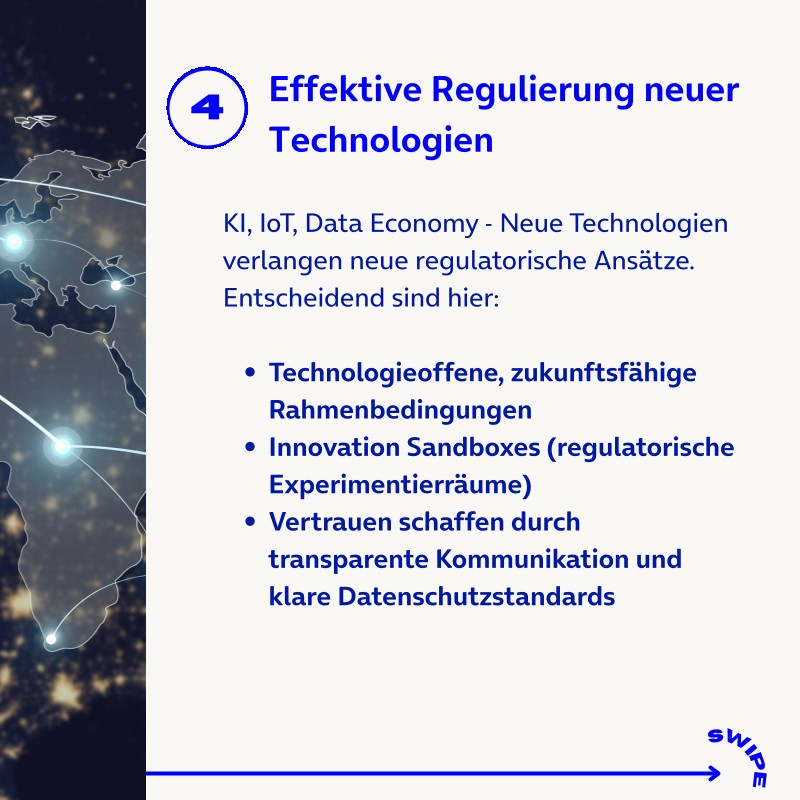 Mit dem Beginn des neuen institutionellen Zyklus der EU ist 2025 ein entscheidendes Jahr für die Neugestaltung der politischen und ordnungspolitischen Strategie der Europäischen Union. Angetrieben von den Empfehlungen in den im letzten Jahr veröffentlichten Berichten von Letta und Draghi scheint die EU mehr denn je entschlossen, ihren Rückstand bei Innovation und Wettbewerbsfähigkeit aufzuholen. Zu den wichtigsten Prioritäten gehören dabei die Stärkung der digitalen Führungsrolle, die Vereinfachung der Regulierung, die Ausrichtung der Wettbewerbsfähigkeit auf Nachhaltigkeit und die Vertiefung der Binnenmarktintegration. Mit dem Kompass für Wettbewerbsfähigkeit wurde ein Weg aufgezeigt, dem es zu folgen gilt.