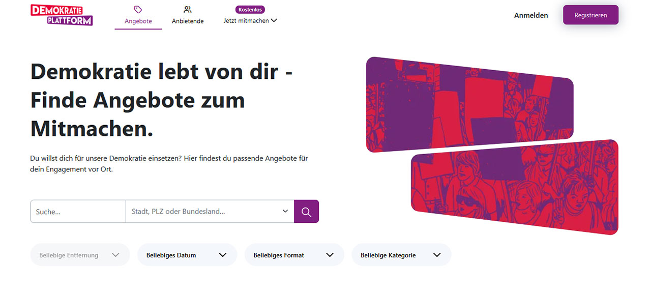Demokratie-Angebote an einem Ort zentral sichtbar zu machen, ist hingegen das Ziel der digitalen Demokratie-Plattform (öffnet in neuem Tab), die vom Verein Artikel 1 (öffnet in neuem Tab) initiiert wurde. Dort erhalten Interessierte schnell und einfach Angebote für demokratisches Engagement und Informationsveranstaltungen. Die fast 200 registrierten Organisationen finden darüber hinaus Dienstleistungen und Werkzeuge, um sich untereinander zu vernetzen und gemeinsam zu handeln.
