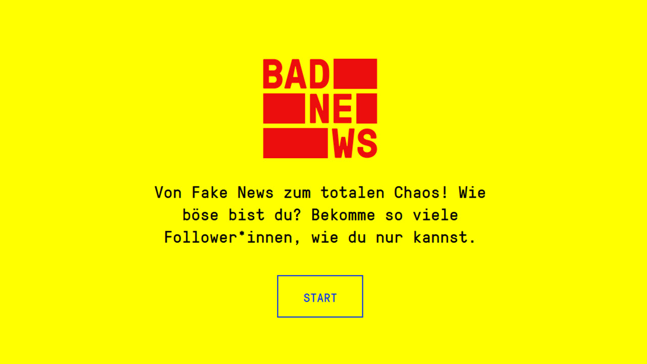 Auf internationaler Ebene z.B. haben die niederländische DROG Group und die Universität Cambridge das leicht zugängliche digitale Spiel Get Bad News (öffnet in neuem Tab) entwickelt, das Gamification nutzt, um das Bewusstsein für Desinformation zu stärken. Auf der Projekt-Website schlüpfen die Spieler:innen ohne Umschweife in die Rolle von Verbreitern von Falschinformationen und lernen so die Mechanismen der Desinformation kennen.