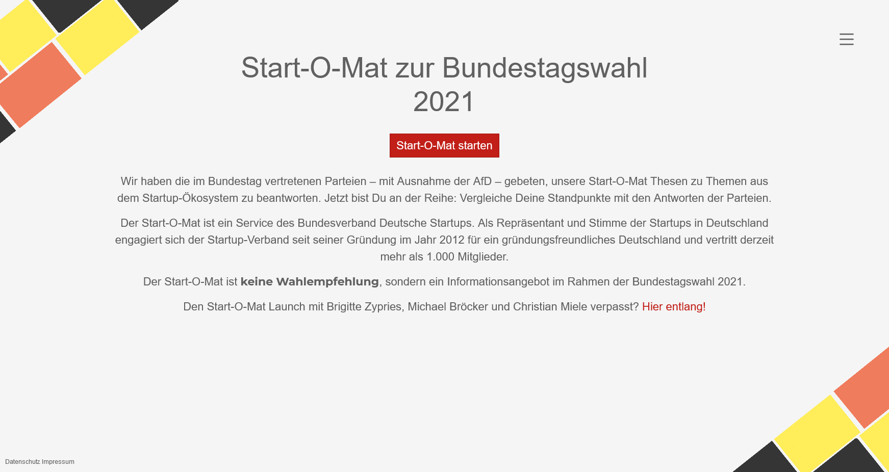 Sie wollen, dass die Innovationskraft von deutschen Startups floriert und das Land gründungsfreundlicher wird? Dann könnte der Start-O-Mat etwas für Sie sein. Der Bundesverband Deutsche Startups hat die Bundestagsparteien mit Ausnahme der AfD über ihre Positionen zum Startup-Ökosystem befragt. Zusätzlich gibt es eine statistische Auswertung der Erwähnungen relevanter Themen in den Wahlprogrammen.