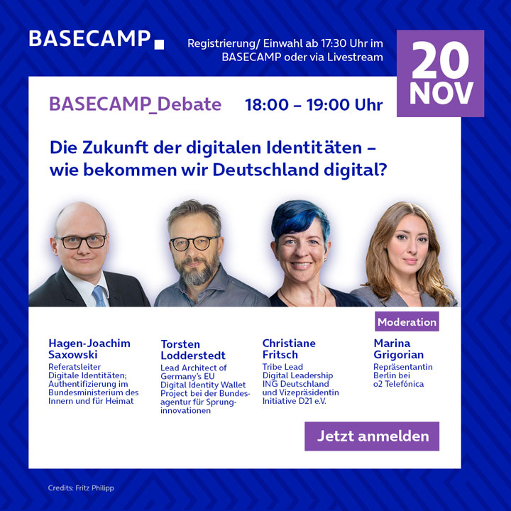 Am 20. November diskutieren wir bei der BASECAMP_Debate mit Hagen-Joachim Saxowski (Referatsleiter Digitale Identitäten im BMI), Torsten Lodderstedt (Lead Architect des EUDI-Projects bei SPRIND) und Christiane Fritsch (Tribe Lead Digital Leadership ING Deutschland & Vizepräsidentin bei D21) über die Zukunft der digitalen Identitäten in Deutschland.