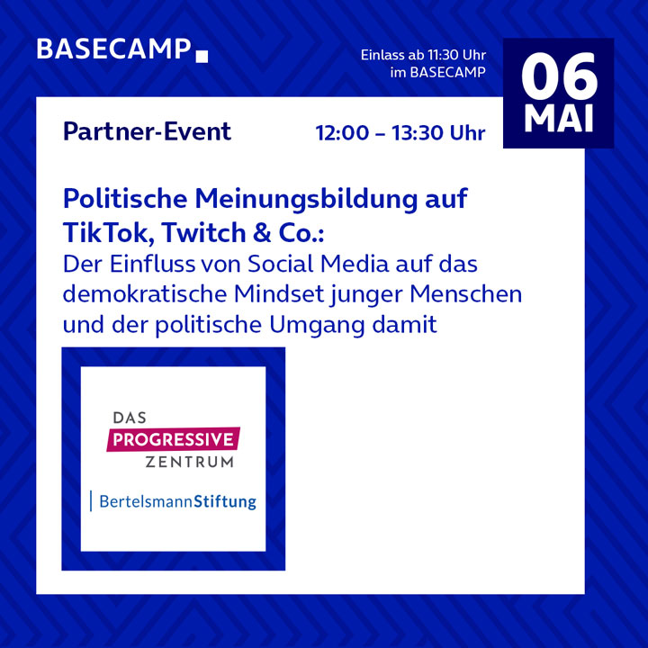 Wir weisen darauf hin, dass bei unseren öffentlichen Veranstaltungen auch Bild- und Tonmaterial in Form von Fotos oder Videoaufzeichnungen durch von uns beauftragte oder akkreditierte Personen und Dienstleister erstellt wird. Die Aufnahmen werden für die Event-Dokumentation und Event- Kommunikation auf den Social-Media-Kanälen des BASECAMP genutzt. Sie haben das Recht auf Information und weitere Betroffenenrechte. Informationen zu unseren Datenverarbeitungen sowie Ihren Betroffenenrechten finden Sie hier.