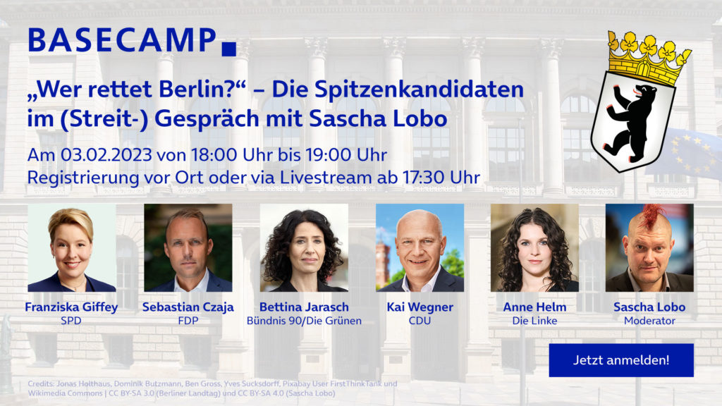 Genau dazu möchten wir mit den Spitzenkandidaten aller demokratischen Parteien am 03.02.2023 von 18:00 – 19:00 Uhr bei uns im BASECAMP in Berlin-Mitte diskutieren.