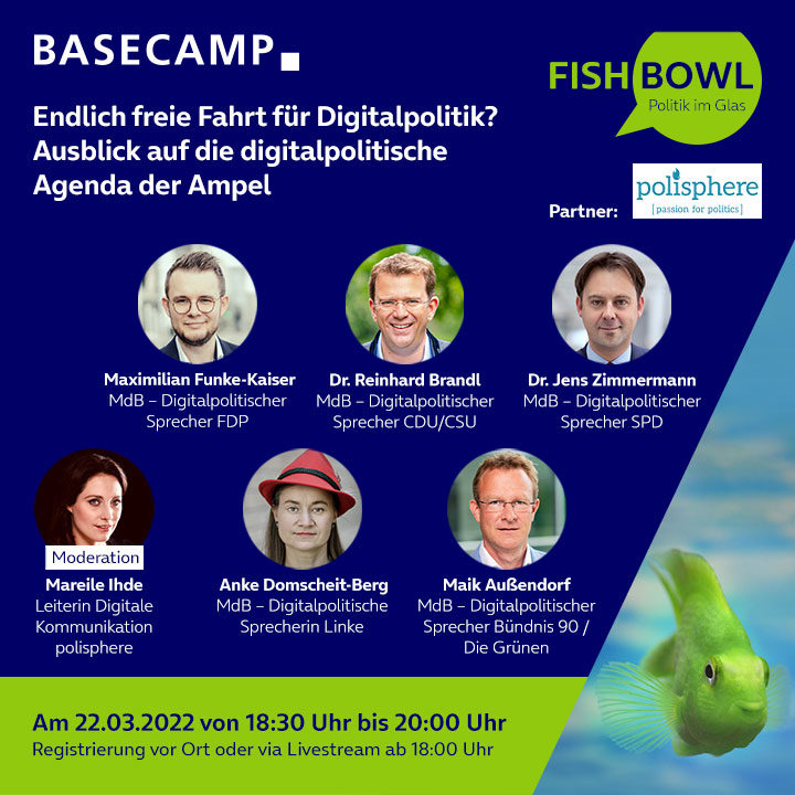 Wir weisen darauf hin, dass bei unseren öffentlichen Veranstaltungen auch Bild- und Tonmaterial in Form von Fotos oder Videoaufzeichnungen durch von uns beauftragte oder akkreditierte Personen und Dienstleister erstellt wird. Die Aufnahmen werden für die Event-Dokumentation und Event- Kommunikation auf den Social-Media-Kanälen des BASECAMP genutzt. Sie haben das Recht auf Information und weitere Betroffenenrechte. Informationen zu unseren Datenverarbeitungen sowie Ihren Betroffenenrechten finden Sie hier.