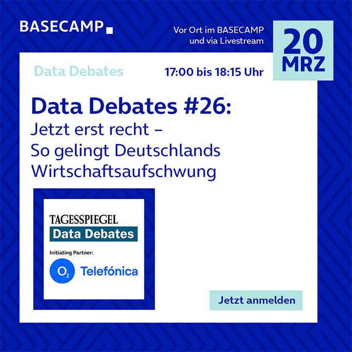 Tagesspiegel Data Debates (öffnet in neuem Tab) finden regelmäßig statt und diskutieren die Auswirkungen der Digitalisierung auf die Gesellschaft. Gäste aus Politik, Wirtschaft, Wissenschaft, Religion und Kultur debattieren über das Potential von Datenschätzen und die Anforderungen an den Datenschutz.