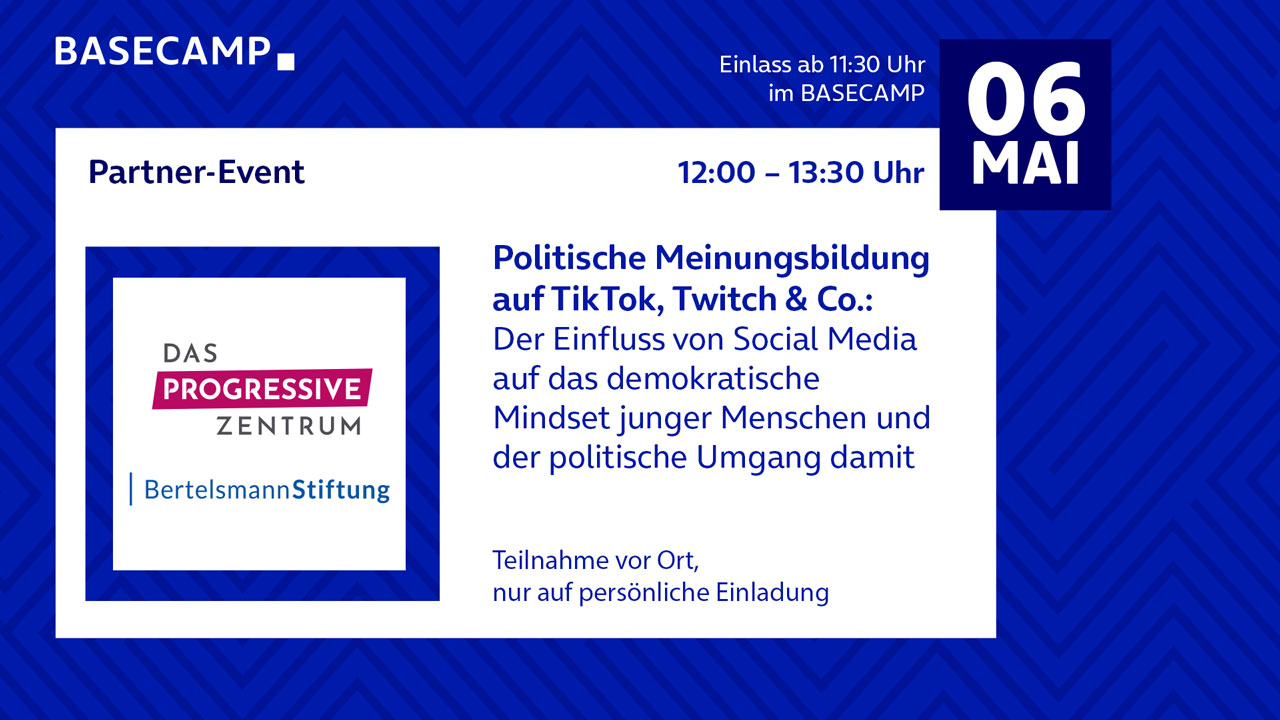 Wir weisen darauf hin, dass bei unseren öffentlichen Veranstaltungen auch Bild- und Tonmaterial in Form von Fotos oder Videoaufzeichnungen durch von uns beauftragte oder akkreditierte Personen und Dienstleister erstellt wird. Die Aufnahmen werden für die Event-Dokumentation und Event- Kommunikation auf den Social-Media-Kanälen des BASECAMP genutzt. Sie haben das Recht auf Information und weitere Betroffenenrechte. Informationen zu unseren Datenverarbeitungen sowie Ihren Betroffenenrechten finden Sie hier.