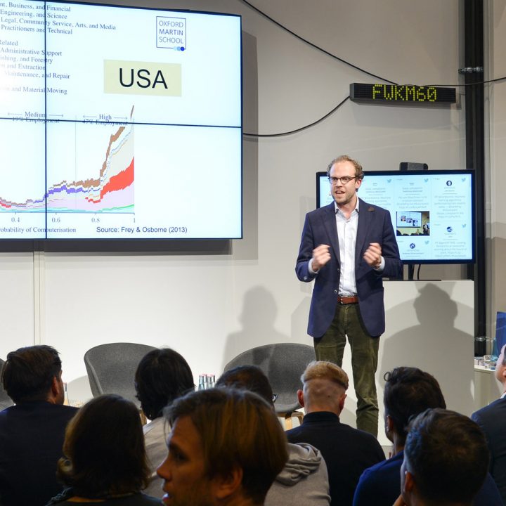 Bei unserer Veranstaltung future.work: Wie die künstliche Intelligenz unsere Arbeitswelt revolutioniert (öffnet in neuem Tab), die wir gemeinsam mit der deutschen Ausgabe von WIRED (öffnet in neuem Tab) organisiert hatten, ging es vor allem um die Frage, ob menschliche Arbeit durch den Einsatz von Robotern und künstlicher Intelligenz (KI) überflüssig wird – oder ob vielleicht sogar mehr Jobs dadurch entstehen. Und die Antworten darauf fielen überraschend positiv aus. Das bemerkt auch der Bericht im Heise-Newsticker (öffnet in neuem Tab) über den Abend, bei dem das Telefónica BASECAMP wieder bis zum letzten Stehplatz voll war. Der Moderator Lars Gaede hatte die Debatte mit seinen interessanten Fragen sofort in Schwung gebracht.