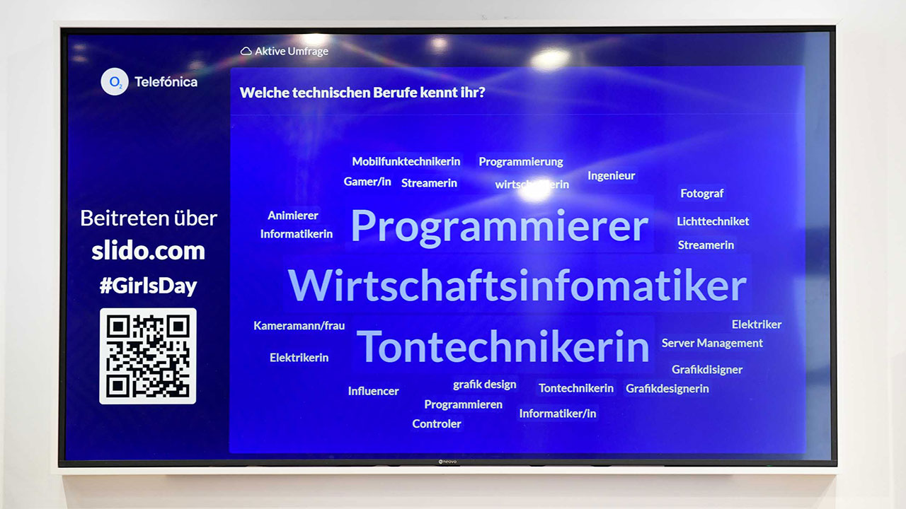 Am eigentlichen Girls‘ Day, dem 28. April, lud Telefónica Schülerinnen ins BASECAMP ein, um ihnen MINT-Berufe aus Sicht der Mobilfunkbranche näherzubringen. Die 22 teilnehmenden Schülerinnen im Alter zwischen 12 und 15 Jahren aus Berlin und Umgebung erwartete dabei ein spannendes Programm. Durch das Event führte die Journalistin Nadine Hadad (öffnet in neuem Tab), die mittels Nachfragen und kurzer Quizfragen die Mädchen immer wieder mit einband.