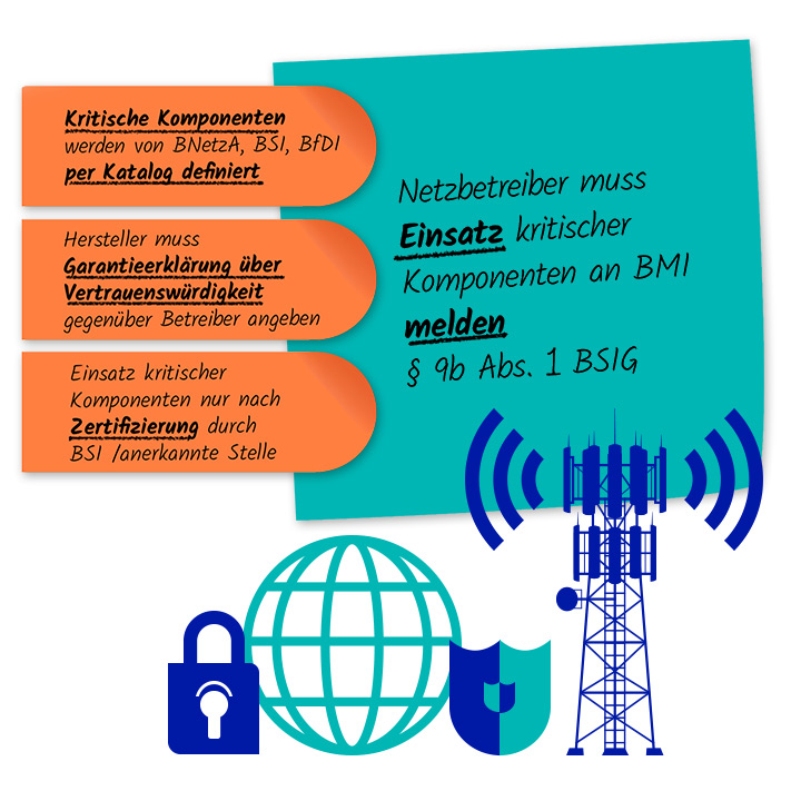 Ein besonderes Augenmerk in der politischen Debatte lag auf den neuen Anforderungen, die für Betreiber kritischer Infrastrukturen (KRITIS) definiert wurden. So ist beispielsweise vorgesehen, dass die Nutzung bestimmter „kritischer Komponenten“ in diesen Infrastrukturen zuvor beim Bundesinnenministerium (BMI) angezeigt werden muss und das Ministerium diese Nutzung untersagen kann. Diese Regelung betrifft unter anderem Telekommunikationsnetzbetreiber sowie ihre Zusammenarbeit mit den Herstellern kritischer Komponenten (öffnet in neuem Tab). Hierfür sollen die Bundesnetzagentur, das BSI und der Bundesbeauftragte für den Datenschutz und die Informationsfreiheit (BfDI) eine Liste kritischer Funktionen definieren. Komponenten, welche diese kritischen Funktionen erfüllen, sollen dann künftig nicht nur beim BMI angemeldet sondern auch zertifiziert werden.