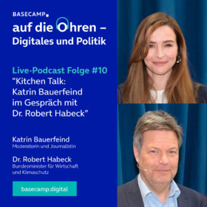 Einen Neustart erlebte 2024 das Format Kitchen Talk (öffnet in neuem Tab), zu dem Moderatorin Katrin Bauerfeind gleich zwei prominente Kabinettsmitglieder im BASECAMP begrüßen durfte: Mit Gesundheitsminister Karl Lauterbach (öffnet in neuem Tab) sprach sie über Persönliches und die Digitalisierung im Gesundheitswesen, während Vizekanzler Robert Habeck (öffnet in neuem Tab) insbesondere die politische Debattenkultur und notwendige wirtschaftliche Veränderungen in Deutschland thematisierte.
