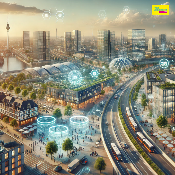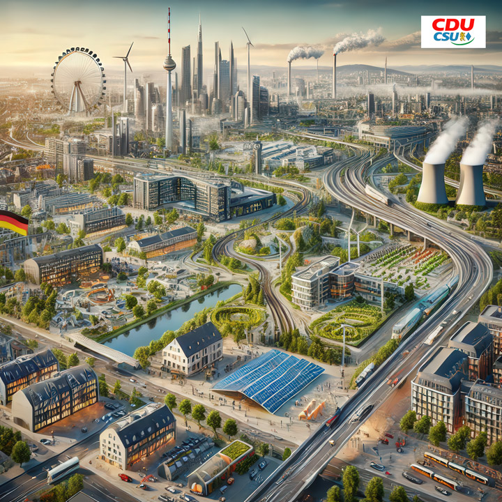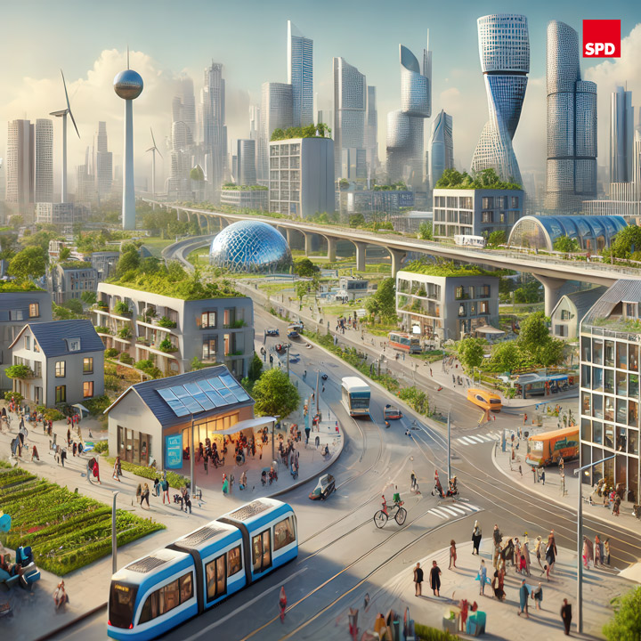 Ich finde besonders spannend, worauf sich die KI konzentriert. Schon der Begriff Zukunft scheint bei der KI oft futuristische Gebäude hervorzurufen. Bei den neuen Bildern, zum Beispiel zur SPD, sind die Gebäude im Hintergrund alle ein bisschen korkenzieherartig. Außerdem legt die KI einen starken Fokus auf Energieversorgung. In den Stadtbildern stehen mitten in der Großstadt Windkraftwerke, Atomkraftwerke oder auch Gas- und Kohlekraftwerke – je nach Partei. Das wirft natürlich Fragen auf, weil wir uns eine solche Zukunft in der Realität kaum so vorstellen können. Aber die KI arbeitet eben mit ihren Trainingsdaten und stellt die Energieversorgung oft sehr zentral dar.