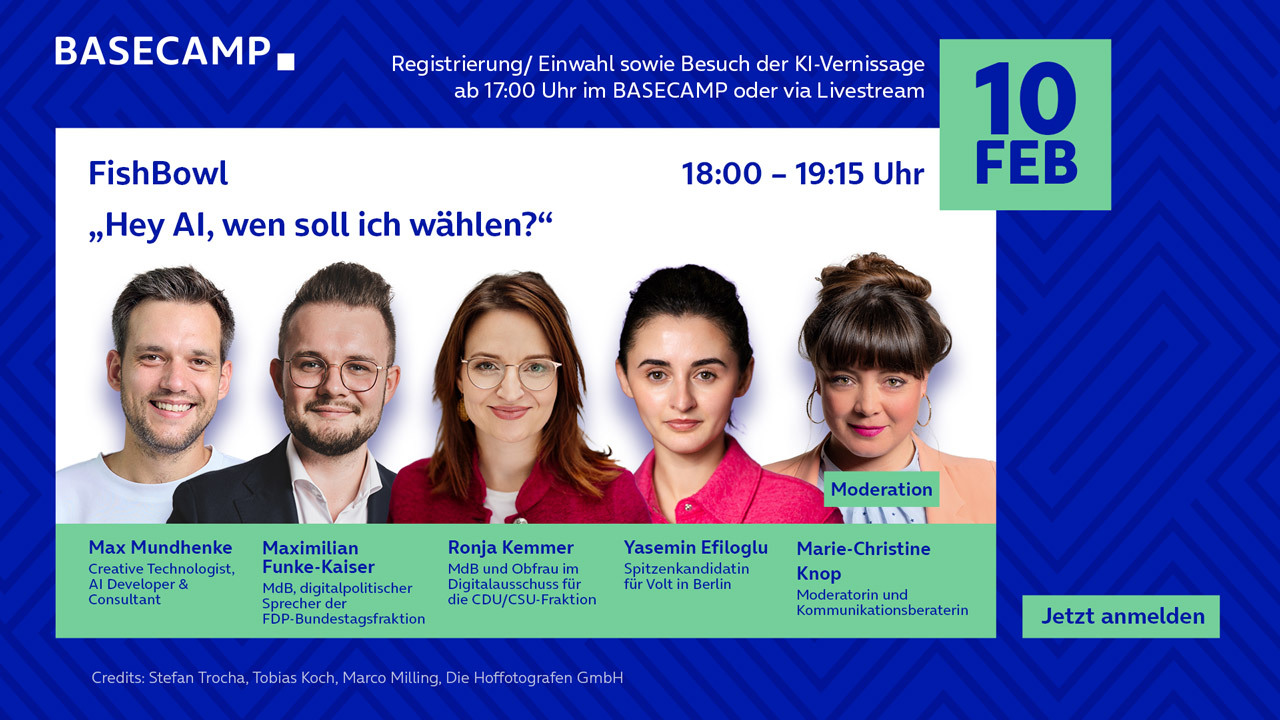Am 10. Februar wird Max Mundhenke zu Gast bei BASECAMP FishBowl sein, um mit Maximilian Funke-Kaiser (FDP), Ronja Kemmer (CDU/CSU), Yasemin Efiloglu (Volt) und Marie-Christine Knop (Moderation) zum Thema „Hey AI, wen soll ich wählen?“ zu diskutieren.