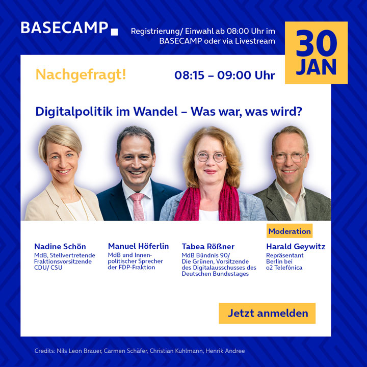 Am 10. Februar wird Max Mundhenke zu Gast bei BASECAMP FishBowl sein, um mit Maximilian Funke-Kaiser (FDP), Ronja Kemmer (CDU/CSU), Yasemin Efiloglu (Volt) und Marie-Christine Knop (Moderation) zum Thema „Hey AI, wen soll ich wählen?“ zu diskutieren.