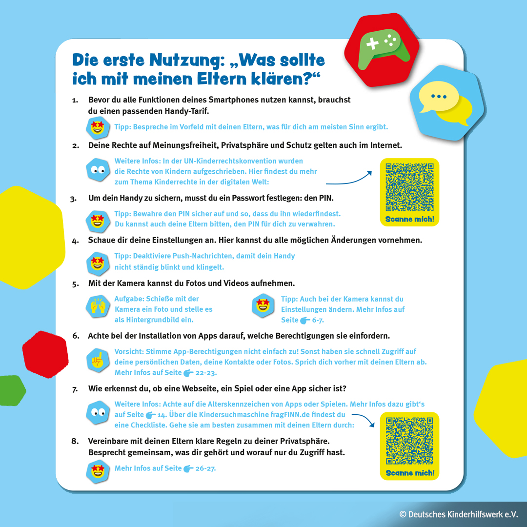 Das Magazin beantwortet wichtige Fragen aus der digitalen Lebenswelt von Kindern rund um die Themen Erstes Smartphone und Internet. Es gibt informative Hilfestellungen und spielerisch-interaktive Anregungen, was Kinder bei der Nutzung von Apps, Games und sozialen Netzwerken beachten sollten, wie sie verantwortungsbewusst mit privaten Daten umgehen, Fake News im Internet erkennen oder sich vor Cybermobbing schützen können.