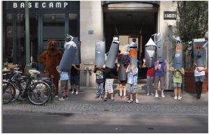 Am 11. und 14. September 2012, jeweils von 09:00 bis 15:00 Uhr, konnte man diese menschgewordenen Mobilfunkgeräte im BASE_camp in Berlin-Mitte, live erleben und bestaunen: Im Rahmen des Kunstvermittlungsfestivals „Kunstherbst für Kids 2012“ (öffnet in neuem Tab) fanden hier zwei Workshops statt, in denen Kinder in selbstgebastelten Masken und Kostümen ihre Vorstellung von digitalen Geräten zeigten.