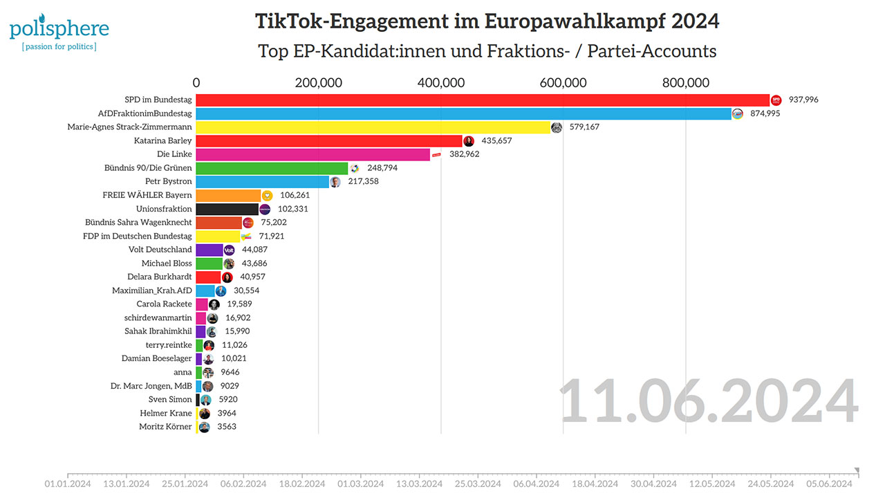 Die Friedrich-Ebert-Stiftung hat ebenfalls eine Analyse der Europawahl (öffnet in neuem Tab) in Deutschland vorgelegt, bei der Social Media aber nur ein Teilaspekt ist. Auch hier steht TikTok im Mittelpunkt, das sich als zentrale Wahlkampf-Plattform für junge Wähler:innen etabliert und wo die AfD als “First Mover” immer noch einen Wettbewerbsvorteil habe. Die anderen Parteien hätten zwar nachgezogen, müssten aber noch einiges aufholen. Die gerade beschriebene Studie des IW wird ebenso erwähnt – unter anderem mit dem Hinweis, dass sich der TikTok-Erfolg von FDP und Strack-Zimmermann jedoch nicht in Jungwähler:innen-Stimmen für die Partei niedergeschlagen habe. Die Zugewinne für die AfD werden dagegen “in Teilen auf eine erfolgreiche Social-Media-Strategie” zurückgeführt, während die Stimmengewinne und -verluste der anderen etablierten Parteien mit Themenkonjunkturen verknüpft werden.