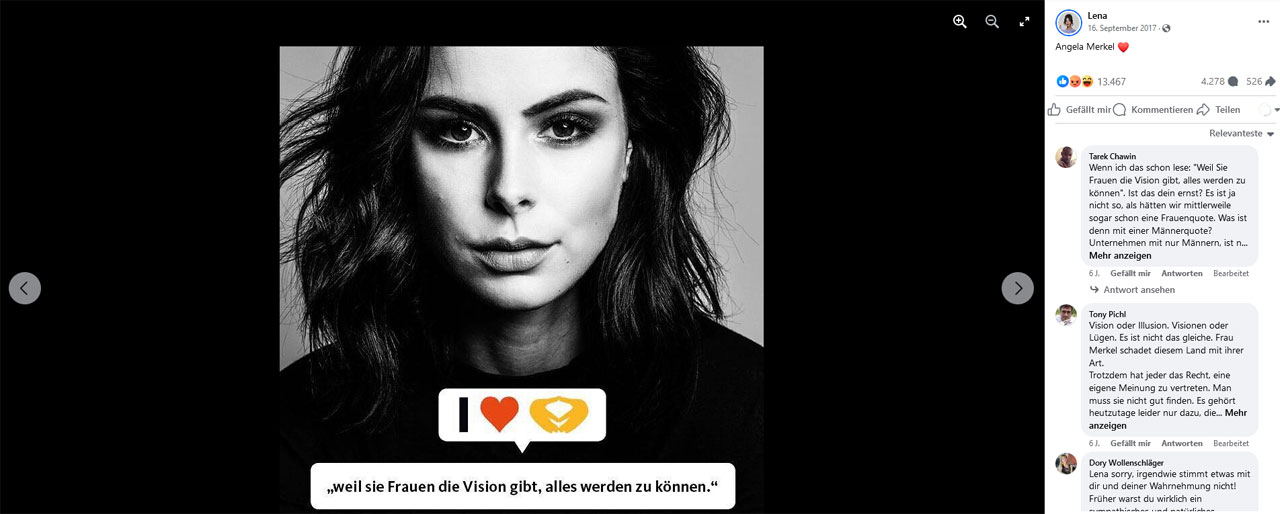 Im Gegensatz dazu hält sich Helene Fischer mit politischen Statements auf ihren Social Media-Kanälen sehr zurück. Stattdessen positioniert sie sich gezielt in Form von organisierten Kampagnen oder live auf der Konzertbühne, was aufgrund ihrer Stellung als Megastar der deutschen Musikbranche durchaus relevant ist. Welchen Einfluss ihre wenigen politischen Äußerungen haben, zeigte vor kurzem eine Ausgabe des Stern (öffnet in neuem Tab) mit ihr als Fixpunkt auf dem Titelbild. Und in ihrem zugehörigen Statement bezog sie klar Stellung: