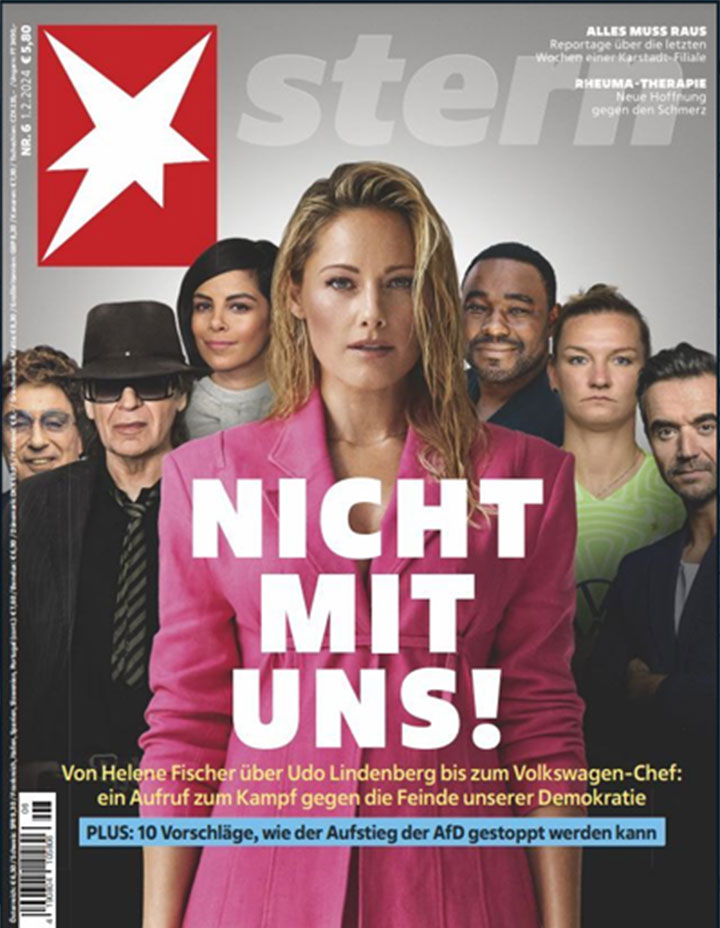 „Bei den kommenden Wahlen in Deutschland und Europa, wird entschieden, in welchem Land wir künftig leben werden. Tut das Richtige, geht zur Wahl! Für die Demokratie und gegen die Extremisten!“ (Helene Fischer im Stern)