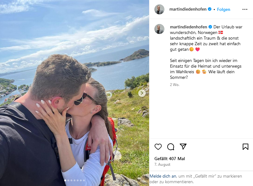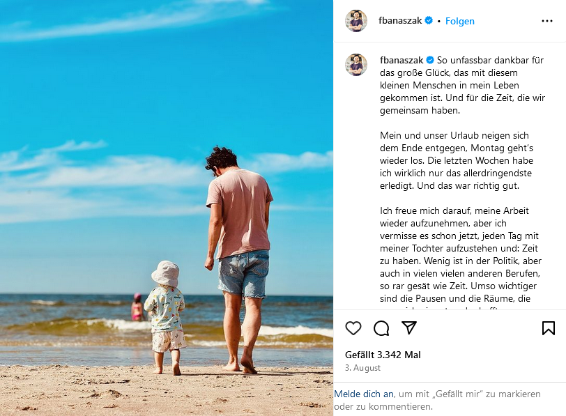 Auffällig ist dabei, dass viele – gerade jüngere – Bundestagsabgeordnete Urlaubsbilder posten, auf denen auch ihre Partner:innen oder Kinder zu sehen sind. Dazu gehören beispielsweise Johannes Vogel (öffnet in neuem Tab) (Parlamentarischer Geschäftsführer der FDP-Bundestagsfraktion), der in den USA unterwegs war, SPD-MdB Jessica Rosenthal (öffnet in neuem Tab), ihre Fraktionskollegen Johannes Arlt (öffnet in neuem Tab) in Schweden und Robin Mesarosch (öffnet in neuem Tab) in den Dolomiten, Felix Banaszak (öffnet in neuem Tab) (Grüne) am Meer oder Jan-Niclas Gesenhues (öffnet in neuem Tab), Parlamentarischer Staatssekretär im Bundesministerium für Umwelt, den es nach Portugal verschlagen hat.