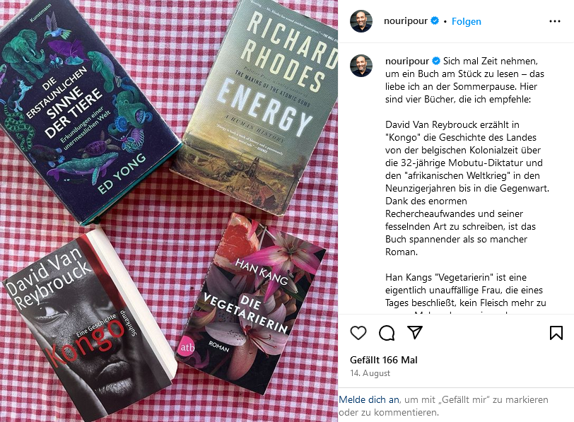 Weitere Politprominenz war dagegen mitteilungsfreudiger: SPD-Chef Lars Klingbeil (öffnet in neuem Tab) tankte Energie in der Lüneburger Heide, seine Kollegin von den Grünen, Ricarda Lang (öffnet in neuem Tab), sendete Grüße aus ihren Flitterwochen, während Franziska Giffey (öffnet in neuem Tab) durch Venedig gondelte. CDU-Bundesschatzmeisterin Julia Klöckner (öffnet in neuem Tab) war lieber in der Heimat unterwegs. Grünen Co-Chef Omid Nouripour (öffnet in neuem Tab) tat sich mit Tipps für die Urlaubslektüre hervor. Und BSW-Mitgründerin Amira Mohamed Ali (öffnet in neuem Tab) nutzte die freie Zeit für ein Konzertbesuch bei ACDC in Hannover.