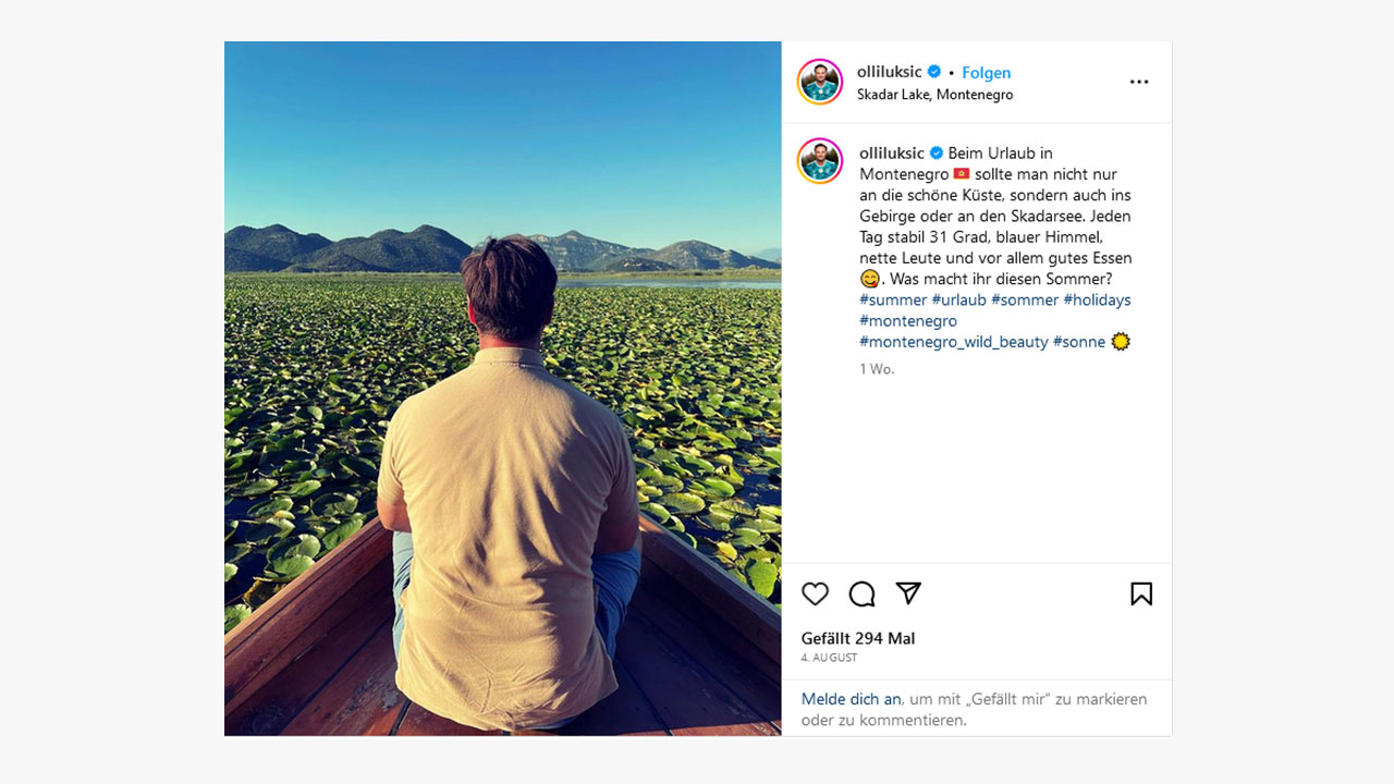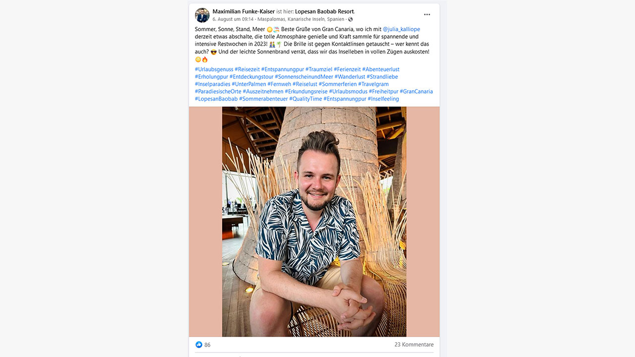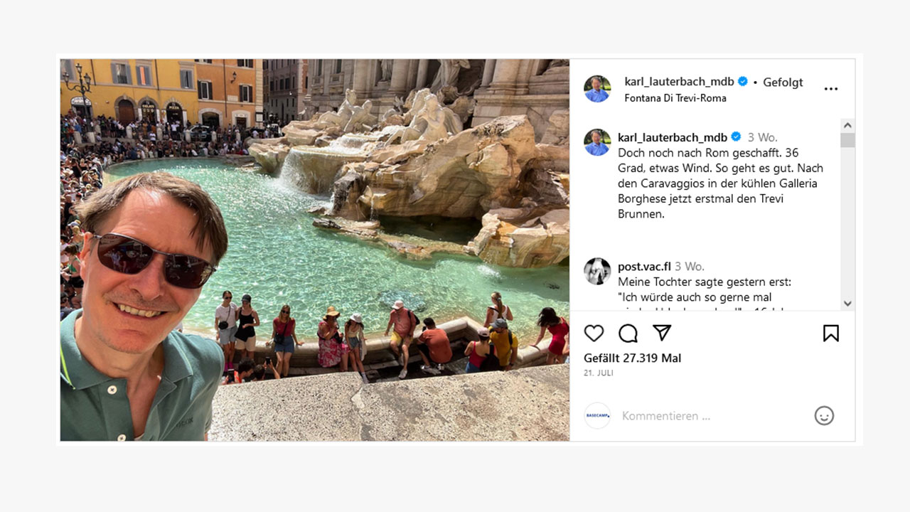Was auf den Social Media-Kanälen vieler Bundestagsabgeordneter ebenfalls nicht fehlen darf, sind Urlaubspostings. Die Bandbreite reicht dabei von Grüßen aus dem heimischen Garten (öffnet in neuem Tab) über den regionalen Wanderurlaub (öffnet in neuem Tab) bis zum klassischen Badeurlaub (öffnet in neuem Tab) im Ausland. Besonders beliebt scheint dafür die Mittelmeerregion zu sein. Der digitalpolitische Sprecher der FDP, Maximilian Funke-Kaiser, verbringt seine Auszeit zum Beispiel auf den kanarischen Inseln (öffnet in neuem Tab), während Gesundheitsminister Karl Lauterbach in Italien (öffnet in neuem Tab) verweilt und sich MdB Robin Mesarosch während seines Urlaubs der „industriellen Früherziehung“ seines Jüngsten widmet. Oliver Luksic, Parlamentarischer Staatssekretär im Bundesministerium für Digitales und Verkehr, wiederum sendet sommerliche Bilder aus Montenegro (öffnet in neuem Tab).