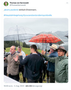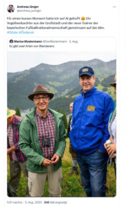 Auf den Social Media-Kanälen ist zudem der Landtagswahlkampf in Bayern deutlich spürbar. Besonders Ministerpräsident Markus Söder (öffnet in neuem Tab) postet viele Bilder von Veranstaltungen und Wahlkampfbesuchen, oft versehen mit längeren Texten, die den Lokalpatriotismus bespielen und die Schönheit Bayerns hervorheben. Ganz ähnlich hält das sein Stellvertreter Hubert Aiwanger (öffnet in neuem Tab) von den Freien Wählern, der mit vielen Beiträgen zugleich aber auch gegen die politischen Gegner schießt. Dies dürfte auch dazu beigetragen haben, dass ein Regenschirm-Bild von Aiwanger und seiner Frau auf Twitter kurzzeitig zum kontroversen Aufreger (öffnet in neuem Tab) wurde. Cem Özdemir gelang ein paar Tage später schließlich eine Anspielung darauf – während der Hauptalmbegehung (öffnet in neuem Tab) zusammen mit Söder und Aiwanger, die dem Internet eine Menge Meme-Material beschert hat.