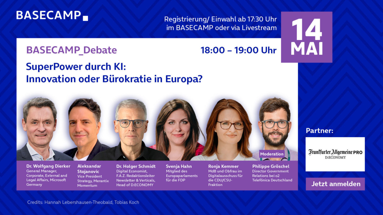 Bei den BASECAMP_Debates geht es hitzig zu. Wir debattieren und diskutieren auf der BASECAMP Bühne mit den Experten aus der Politik, Wirtschaft und Wissenschaft. Hier kommen Meinungsführer zusammen, um gesellschaftliche und politische Auswirkungen der Digitalisierung von verschiedenen Seiten zu beleuchten, zu analysieren und manchmal auch zu polarisieren. Auch unsere Gäste kommen wie gewohnt zu Wort.