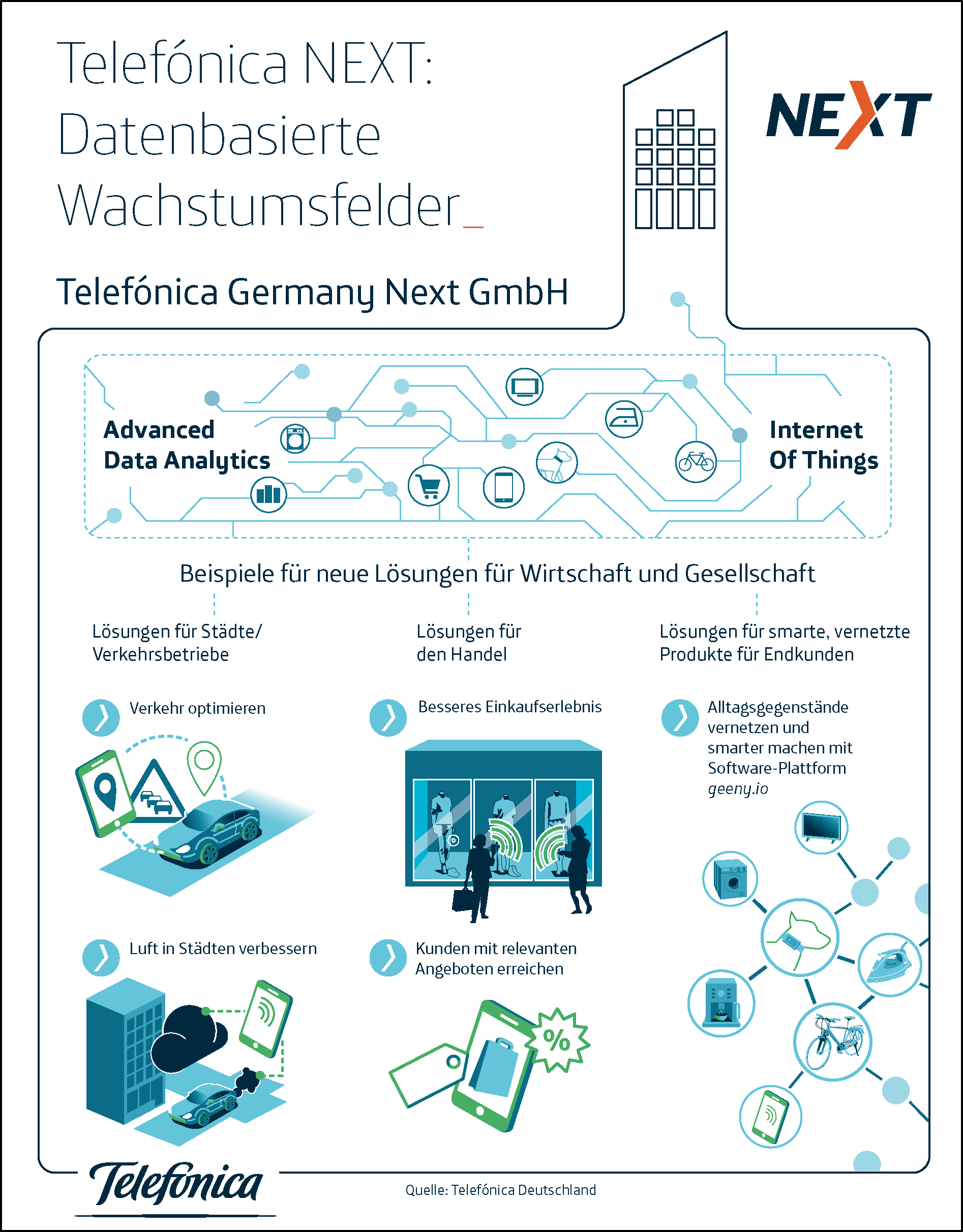 Telefónica NEXT versteht sich als Partner der Wirtschaft, der anderen Unternehmen Lösungen anbietet, damit sie die Wachstumschancen der Digitalisierung besser nutzen können. Unser Geschäftsbereich Advanced Data Analytics richtet dabei seinen Blick auf den gesellschaftlichen und wirtschaftlichen Nutzen, der sich aus der Analyse großer Datenmengen ziehen lässt. Daraus entstehen in Zukunft neue Lösungen für alle Bereiche des Lebens: von Mobilität und Gesundheit über den privaten Konsum bis zur öffentlichen Verwaltung. Für diesen Markt wird in Deutschland ein jährliches Wachstum von fast 30 Prozent erwartet.