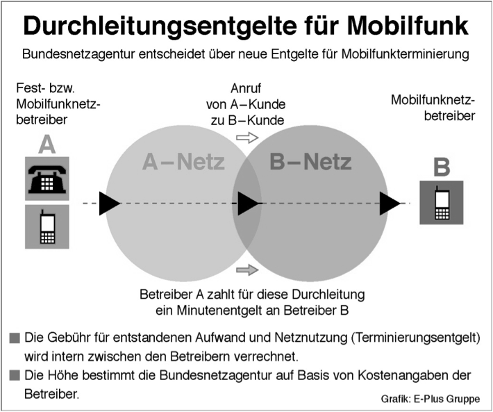 Diese Terminierungsentgelte gibt es im gesamten Telekommunikationsmarkt. Das Grundprinzip ist ganz einfach: Wenn ein Teilnehmer A aus dem A-Netz den Teilnehmer B im B-Netz anruft, zahlt er seinem A-Netzbetreiber dafür etwas (ob nun pro Minute oder als Flatrate quasi im Paket). Im Hintergrund bezahlt aber auch der Netzbetreiber A an den Netzbetreiber B etwas. Das sogenannte Terminierungsentgelt bekommt der den Anruf aufnehmende Netzbetreiber, um dessen Aufwand und die Nutzung seines Netzes zu entgelten. Das ist gewissermaßen sein Anteil an den Einnahmen des A-Netzbetreibers.