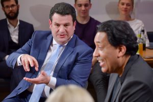 Nachholbedarf gebe es in traditionelleren Branchen wie Textil, Druck und Handwerk. Heil ergänzte, dass es hier „einige Faktoren gibt, die zusammenwirken. Zum einen die Demographie und die gute Lage am Arbeitsmarkt, es gibt mehr Stellen für immer weniger Bewerber“. Und ab 2025, wenn die Babyboomer in Rente gingen, werde dieser Mangel noch grösser, das betreffe dann auch Gewerkschaften und Tarifstrukturen gerade in den von Müller erwähnten traditionellen Branchen. Für Heil sind flexible Löhne und Arbeitszeiten, inklusive Home Office, eine mögliche Lösung.