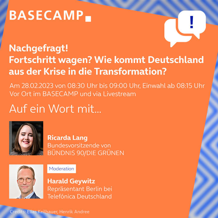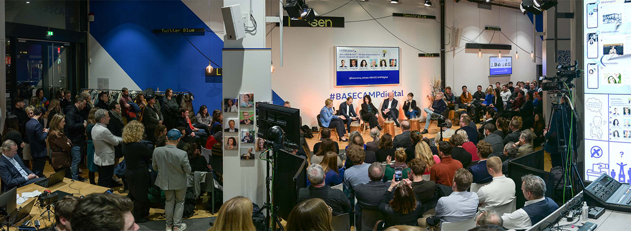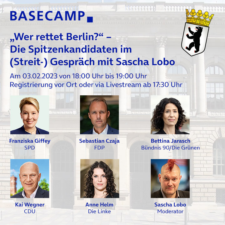 Vorherrschendes Thema im BASECAMP von Telefónica Deutschland in Berlin Mitte ist eigentlich die Digitalisierung in all ihren Facetten. Doch eine Woche vor der Wahlwiederholung stand die Politik des Stadtstaats im Mittelpunkt und das Interesse an der Diskussion der Berliner Spitzenkandidaten war außerordentlich groß, im Saal wie beim Livestream.